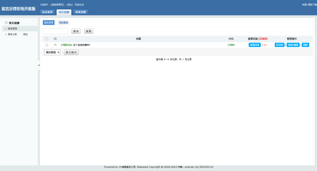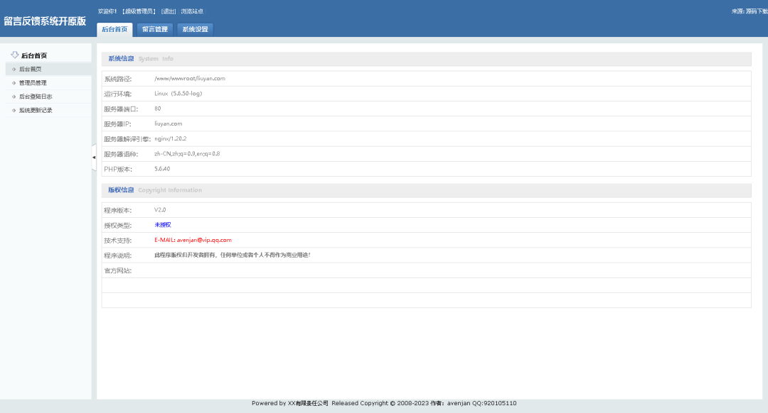 开源PHP留言反馈管理系统是二次开发的一套适用于中小企业及个人网站的留言反馈管理程序系统,基于 PHP + MySQL + Bootstrap 开发。 技术架构 PHP7.0 + nginx + mysql5.7 + JS + CSS + HTML cnetos7以上 + 宝塔面板 文字搭建教程 1.下载源码,宝塔添加一个站点,PHP版本选择7.0。 2.压缩源码目录,上传到宝塔的网站根目录当中解压缩,新建一个空的数据库。 3.访问 域名/install 进到环境检测页面,根据信息填写即可安装完成。